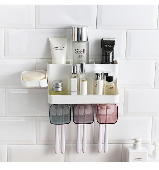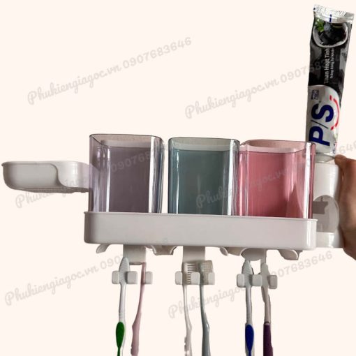 Thiết kế: 3 cốc, 6 vị trí treo bàn chải, 1 khay, 1 hộp đựng đồ, 1 khay đựng cục xà bông, 1 chốt nặn kem đánh răng